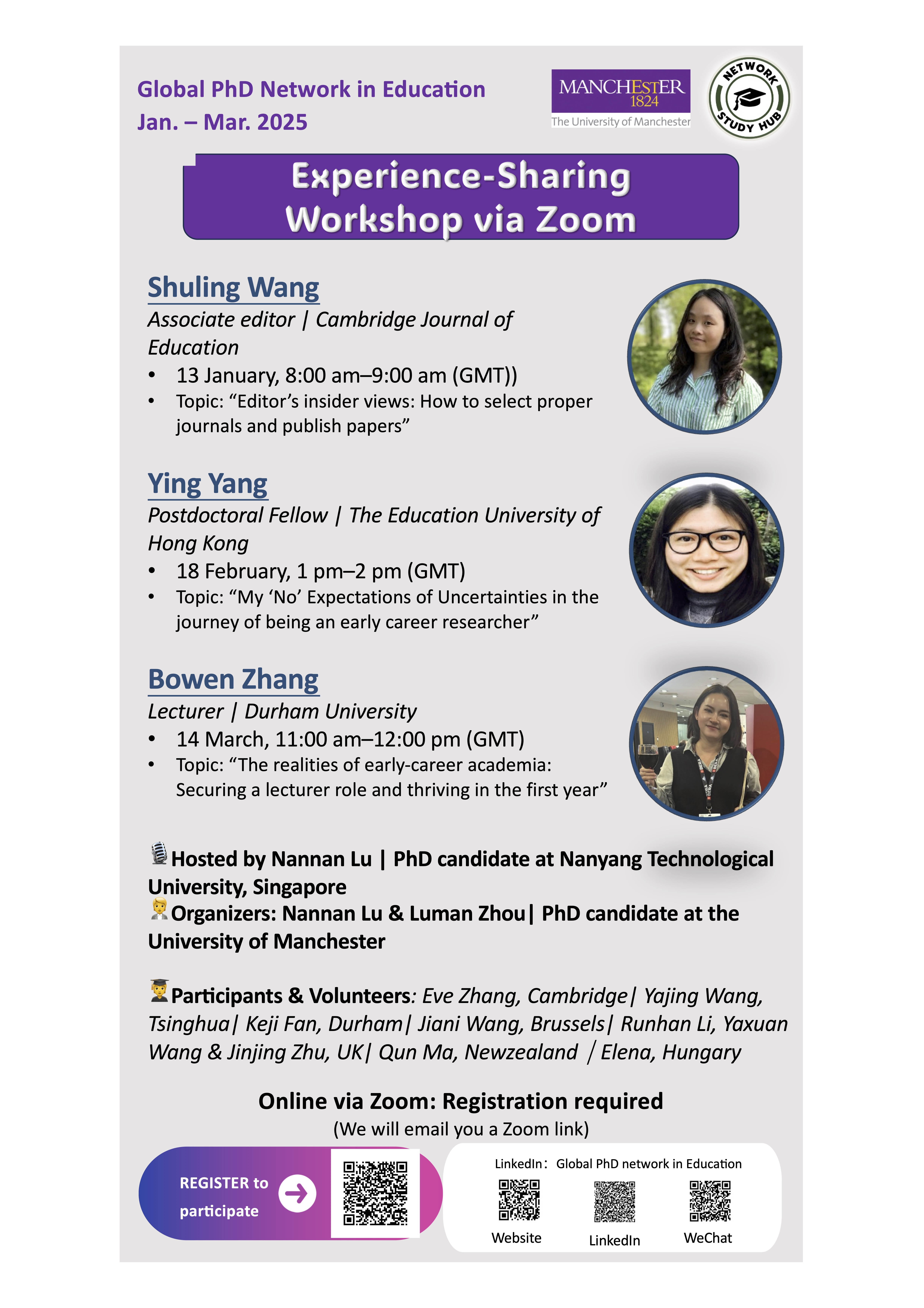 We has grown to a global community of over 400 PGR members from 129+ universities across 25+ countries, including the UK, France, New Zealand, Canada, the US, India, South Africa, Finland, China, Singapore, Brazil, and more. Participating institutions include globally renowned universities such as the University of Manchester, University of Cambridge, Harvard University, UCL, Boston College, McGill University, University of Auckland, Nanyang Technological University, and Beijing Normal University.