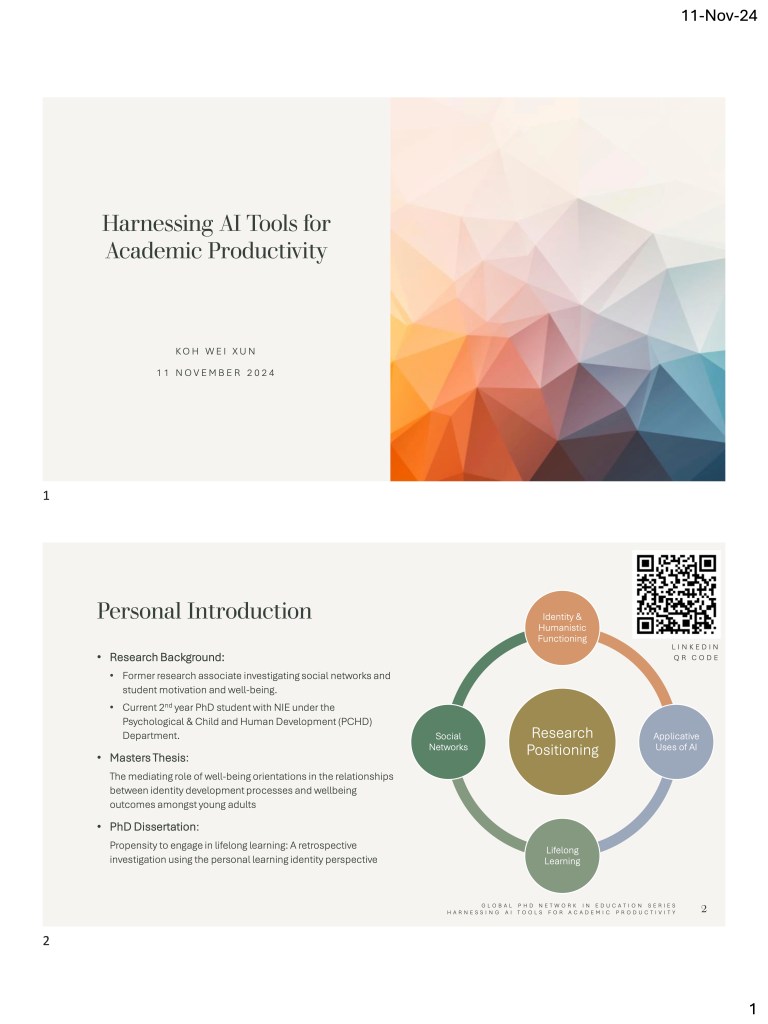 Koh Wei Xun is a Year 2 PhD student at the National Institute of Education, focusing on lifelong learning and its psychological aspects. His interest includes identity and humanistic functioning, and he also has a strong background in social networks. Koh Wei Xun introduced his experience in using AI tools in research, emphasizing their usefulness in automating repetitive tasks and improving productivity.